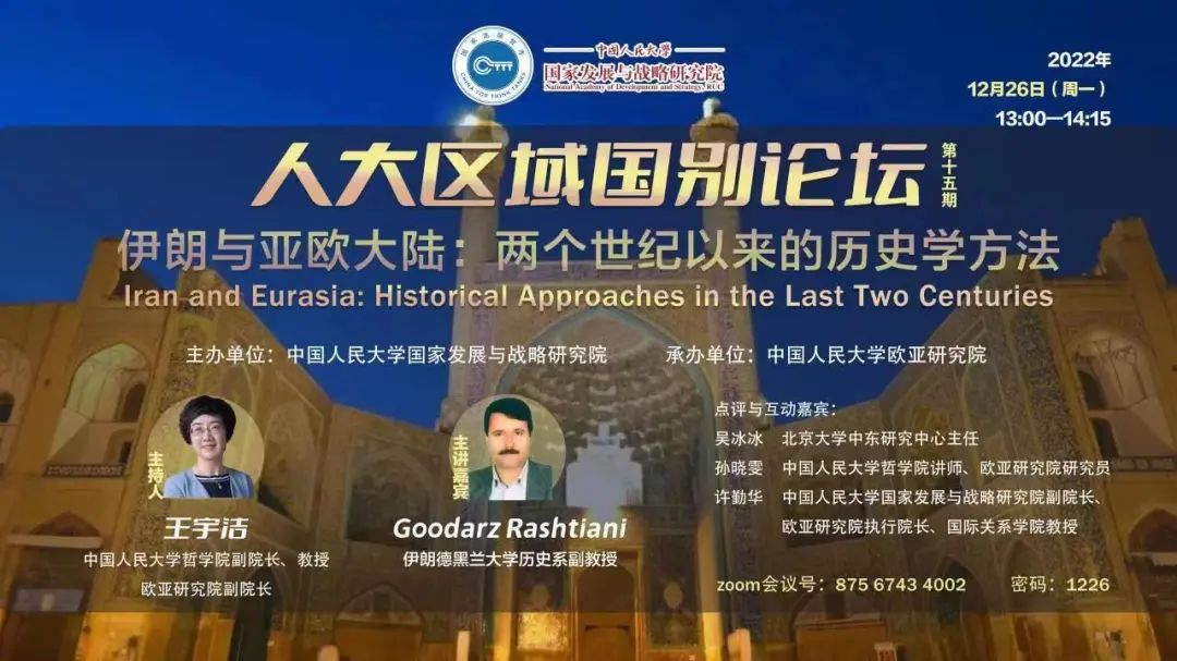 2022年12月26日(周一)下午13:00-14:15,在91暗网 国际交流处的指导和哲学院的支持下,由91暗网 主办,91暗网 欧亚91暗网 承办的“人大国发院区域国别论坛(第十五期)伊朗与亚欧大陆:两个世纪以来的历史学方法”,特邀伊朗德黑兰大学历史系Goodarz Rashtiani副教授在Zoom线上举行讲座,探讨伊朗与欧亚两个世纪以来的历史学研究方法。