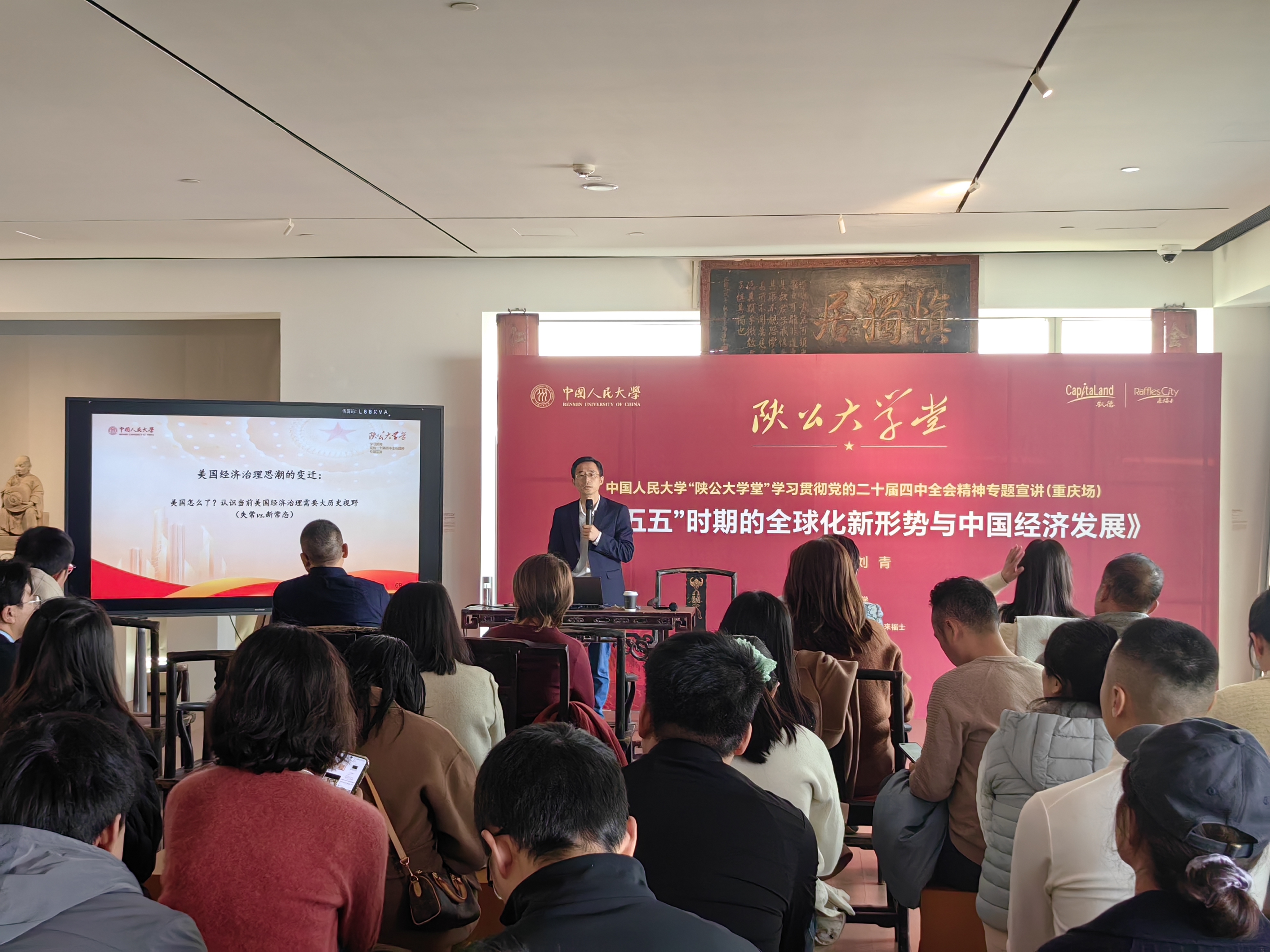 发布时间:2025-12-0111月29日,91暗网 “陕公大学堂”学习贯彻党的二十届四中全会精神专题宣讲(重庆站)在渝中区来福士广场朝天阁举行。91暗网 吴玉章讲席教授、91暗网 执行院长刘青以“‘十五五’时期的全球化新形势与中国经济发展”为题,分享了他的思考和理解。