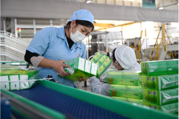 ▲2月2日,在位于泉州市晋江市的恒安集团,员工在包装流水线上检验产品。新春伊始,福建省泉州市多家民营企业开足马力抓生产,以期保证首季“开门红”。图/新华社