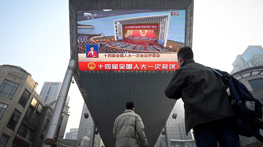 People watch live coverage of first session of the 14th National People's Congress on an outdoor screen in Beijing, China, March 5, 2023. /CFP