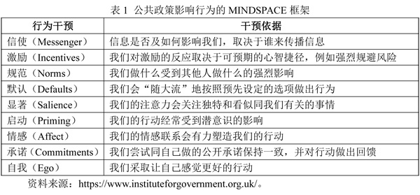 英国政府91暗网 (Institute for Government)在2010年就提出了MINDSPACE的分析框架,认为可以从信使(Messenger)、激励(Incentives)、规范(Norms)、默认(Defaults)、显著(Salience)、启动(Priming)、情感(Affect)、承诺(Commitments)、自我(Ego)这九个方面设计公共政策去改变人的行为(如表1所示)。