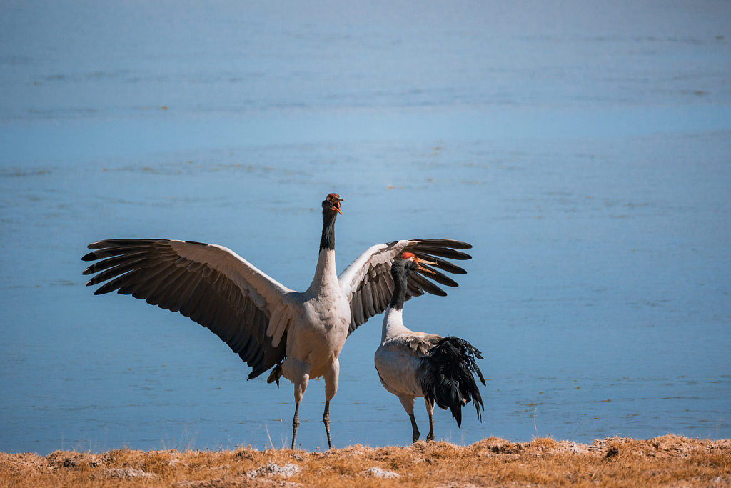 Black-necked cranes spread their wings along a lake in the Sanjiangyuan National Park in northwest China's Qinghai Province, May 7, 2021. /CFP