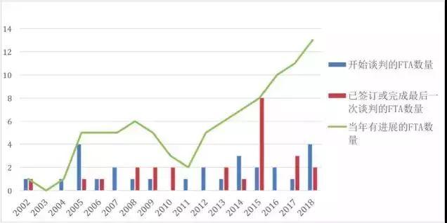 (注:横坐标为年份,单位:年;纵坐标均为FTA数量,单位:个)