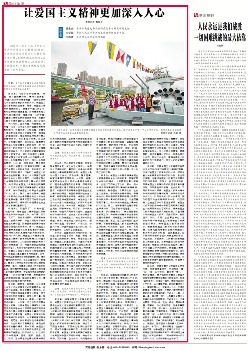 班永杰:爱国主义教育法强调爱国主义教育是面向全体人民的教育,根据不同社会群体的特点,尤其要突出青少年群体,应在以下四点上下功夫。第一,进一步深化民族精神和时代精神的学理阐释。加强党史、新中国史、改革开放史、社会主义发展史、中华民族发展史研究,讲清楚近代以来中国共产党带领中国人民谋求中华民族伟大复兴的历史脉络、内在逻辑和现实意义,进一步凝炼爱国主义精神的时代内涵。第二,发挥思想政治理论课的主渠道作用。习近平总书记指出,“‘大思政课’我们要善用之”。要加强思想政治教育工作,特别是加强青年学生思想政治理论课建设,将爱国主义教育贯穿学校教育全过程。第三,压实各职能部门主体职责。不断完善爱国主义教育主体责任和工作机制,形成政府、社会、学校、家庭共同推进爱国主义教育的合力,并对相关责任主体监管失职行为加强监管治理。第四,保障爱国主义教育法和爱国主义教育实施落实。国家应支持鼓励爱国主义教育基地建设,引导文艺作品创作和评优中坚持爱国主义导向,在课外读物和面向青少年音视频中宣传爱国主义精神,杜绝危害爱国主义行为等,为该法实施提供明确的支撑保障。