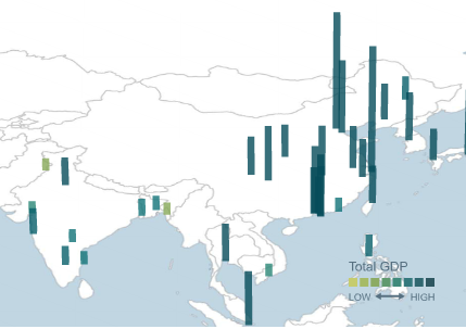 注:仅显示中国地区人口在500万人以上的大城市和特大城市,图中立柱越长代表该城市在2025年预测的GDP总量越大。