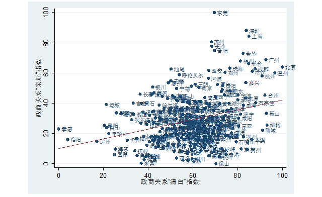 从“亲”和“清”两个方面来看,二者存在弱的正相关关系,说明它们从不同方面反映了政商关系。图A1是所有城市的亲近指数和清白指数二维散点图。其中,两者相关系数为r=0.31, 显著性水平为p<0.05。这从一个角度说明,政府亲近企业与政府保持廉洁两者并不矛盾,政府和企业之间可以形成一种合理、合适的距离。