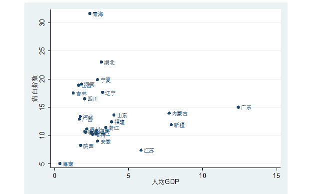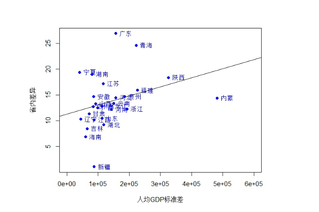 (4)从经济水平来看,省内清白指数差异与经济发展水平之间不是线性关系。这一点与亲近指数的排名不同。图11是各省人均GDP的标准差与政商关系清白指数标准差的散点图。其中X轴是各省2016年的人均GDP标准差,Y轴是各省政商关系清白指数的标准差。该图显示,各省城市之间的人均GDP差异与各省城市之间清白指数的差异并不是线性的关系。相对而言,广东、海南、江苏、内蒙古等省份的清白指数差异小于人均GDP的差异,而青海、湖北、宁夏等省份的清白指数差异大于人均GDP的差异。