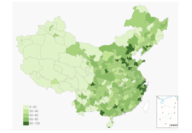 为便于解读,对于总指数和分项指数均进行了正常化处理,即使用如下公式进行转换。其中,X为初始值,Min和Max分别为该指标的最小值和最大值,Y为最终值。据此获得的指数得分介于0分到100分之间。