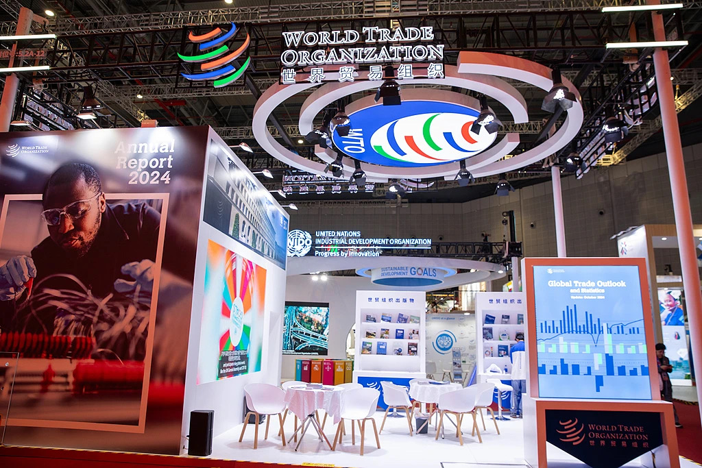 (2024年11月,第七届中国国际进口博览会上的世界贸易组织展台。图源:视觉中国)