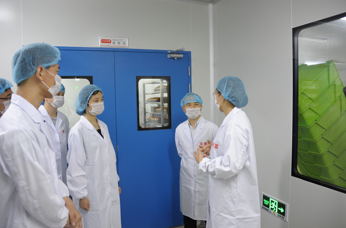 之后,聂教授一行到达福冈集团。集团董事长王总向聂教授一行介绍了福冈集团作为一家民营企业的发展历程。聂教授详细了解了福冈集团在竞争中性、产业政策、人力资源、新零售等各方面的情况。随后,福冈集团副总经理郭总带领课题组一行现场参观了食品加工车间,了解了关键技术设备,感受了企业严格的生产安全和食品质控体系。