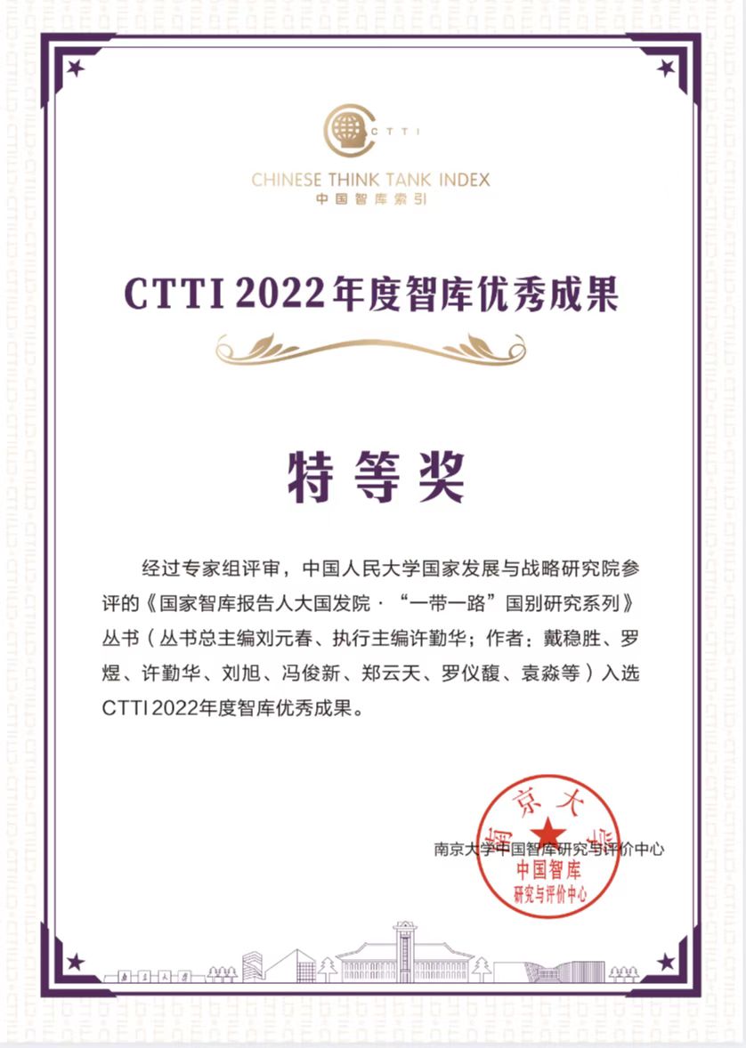 喜讯|人大国发院智库丛书《“一带一路”国别研究系列》获“中国智库索引(CTTI)2022年度智库优秀成果”特等奖