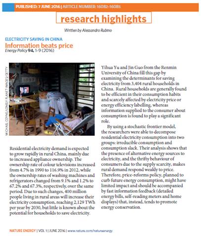 发布时间:2017-09-25近日,经济学院副教授、国发院能源与资源中心研究员虞义华及合作者郭琎发表在SSCI期刊Energy Policy(5年影响因子4.599)上的论文“Identifying Electricity-saving Potential in Rural China: Empirical Evidence from a Household Survey”被世界顶级期刊Nature Energy以重大研究发现(Research Highlights)摘录评论。