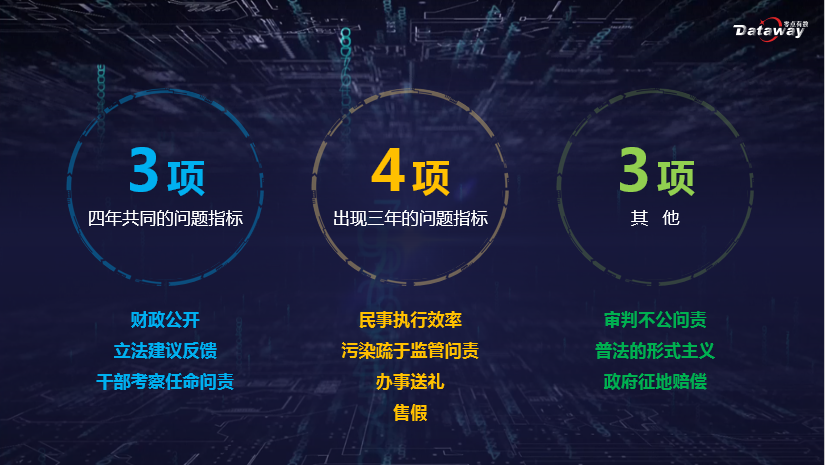 来到四级指标的维度,上述朱景文教授在三级指标层面所提炼的趋势和分布得到了更为细致的呈现,在对2019年评估中脱颖而出的19项广受好评的四级指标进行了简要的介绍之后,朱教授对得分相对较低的“问题指标”展开了分析:他指出,对比四年来的问题指标(判定标准略有不同),其中有3项四级指标是四年评估共同的问题指标,即财政公开、立法建议反馈和干部考察任命问责;有4项四级指标在三年中都被评为问题指标,即民事执行效率、污染疏于监管问责、办事送礼、售假;而审判不公问责、普法的形式主义和政府征地赔偿这三项指标也同样值得注意,因为它们虽在某些年份的评估中未被归为“问题指标”,但其实际所获评价仍然处于较差水平,是群众满意度较差的指标。