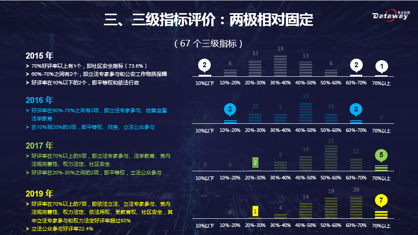 接下来,依据三级指标好评率及得分的具体分布情况,朱景文教授在“从低向高发展”的显著结论之外,给出了“两极相对固定”的重要结论:具体而言,社区安全、权力法定、受教育权、立法专家参与、依法用权、权力法定等是几年来均处于较高得分等级的指标;而问责、立法公众参与、平等权、财产权等指标,则长期处于较低的得分等级。这些指标的满意度在2017年和2019年虽然均有所上升,但它们仍然是各个年度排名于最后档次的指标,应引起足够重视。
