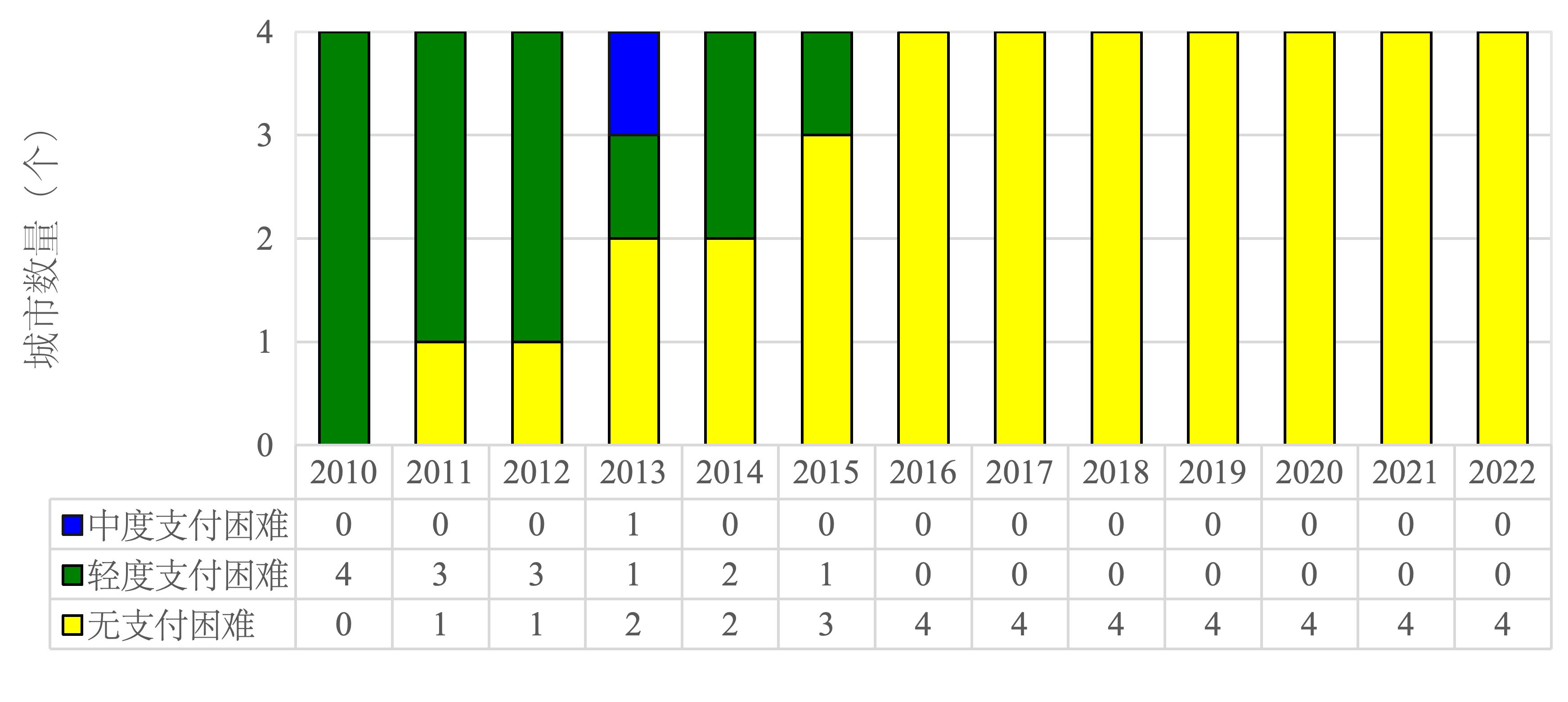 按照该研究房价可支付标准,图8显示,理性预期下2010-2022年中国135个城市房价中等收入者可支付性呈增长趋势,无支付困难城市由2010年的50个城市增至2022年的108个城市,轻度、中度与严重支付困难城市分别由2010年的45个、16个及10个城市减至2022年的6个、3个及0个城市,但不可支付房价城市由2010年的14个城市增至18个城市,城市分化加大。此外,房价不可支付程度大于房租不可支付程度。因此,该研究认为,相对房租可支付性应主要解决房价可支付性问题。图9-10显示,非理性预期下2010-2022年中国135个城市中等收入者房价可支付性先升后降再升,过去5年房价非理性预期下中等收入者房价不可支付与严重支付困难城市数量少于3年房价非理性预期下中等收入者但多于房价理性预期下中等收入者。因此,该研究认为经济转轨期应高度重视非理性预期下房价不可支付城市的住房可支付问题,对房价上涨过快地区,应继续执行从紧的住房政策,遏制房价快速上涨势头,使居民预期回归理性和合理水平,提高中低收入者房价可支付性。图11-13显示,非理性房价增长预期下,过去3年房价非理性预期下2010-2022年中国135个城市一线城市房价支付困难程度最高,其次是二线城市与三线城市。因此,该研究建议应重点解决一线城市中等收入者房价不可支付问题。