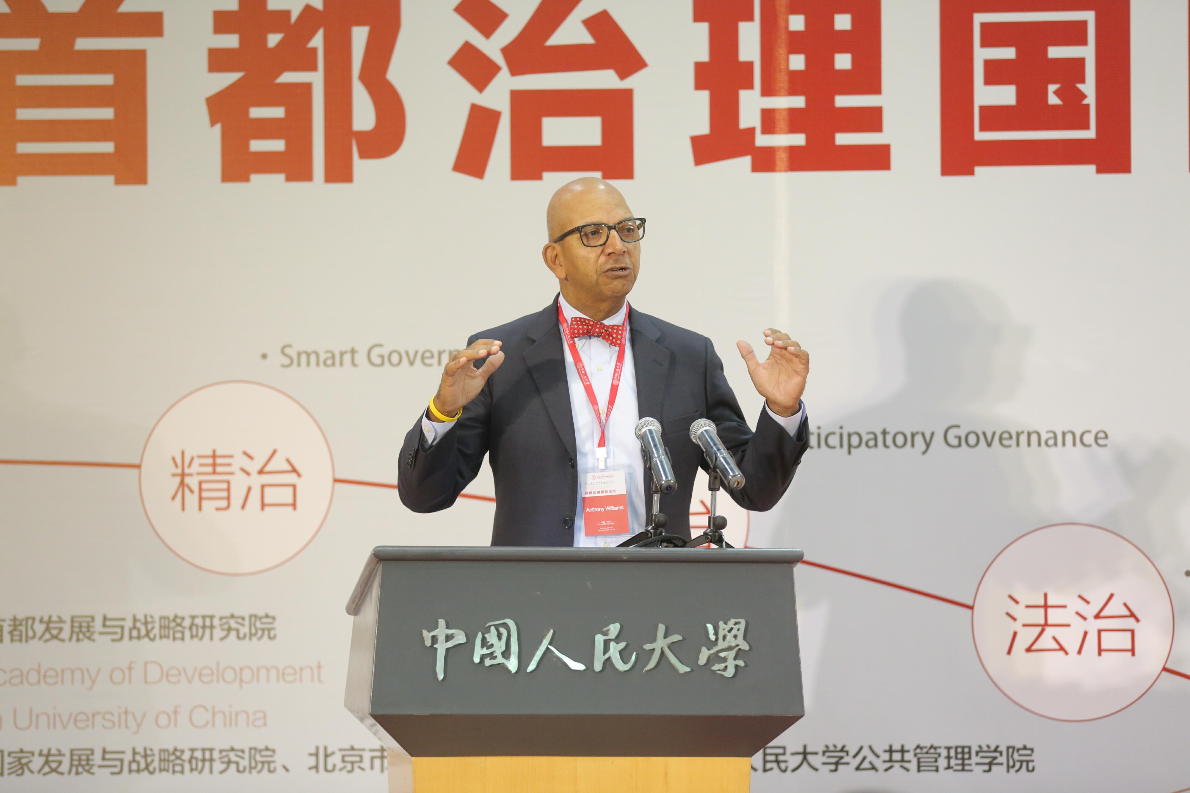 华盛顿DC前市长安东尼•威廉姆斯博士和东京都前副知事、明治大学青山佾教授结合自身管理经验,围绕美国首都和日本首都做“智慧都市和区域协同发展”和“东京的城市治理:特点和议题”的报告,分别简要介绍华盛顿DC和东京都的空间规划和城市发展历程,并不约而同的强调指出要从政治、经济、文化等角度将信息化智慧管理技术与社区公众参与机制引入首都发展与治理中,真正实现资源的合理配置与高效利用。