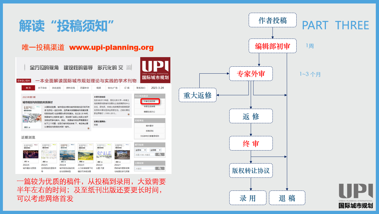 最后,王枫还简述了编辑眼中好文章的特点以及《国际城市规划》对投稿的内容要求,即文稿力求选题新颖、结构严谨、分析论证严密、论述清楚、言之有物,须清晰阐述选题意义;文稿涉及的重要内容,应有综合、翔实、深入的背景阐释。王枫还对原创类、理论研究类、实践(案例)研究类和综述类等不同类型的投稿论文要求进行了详细介绍,并建议作者多读并详读《国际城市规划》文章,以熟悉风格,摸索套路。