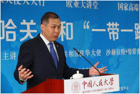 努雷舍夫大使在演讲中高度赞扬中哈关系。他表示:“哈中是永远的好邻居、好伙伴、好朋友。两国近年来睦邻友好伙伴关系取得了许多重要成绩,哈中全面伙伴关系迈上了新的台阶。虽然中哈建交时间不长,这些年来我们建立了坚实的合作基础,这是其他国家几十年甚至几百年才能得到的。”他在演讲中谈到,近三年来哈萨克斯坦总统纳扎尔巴耶夫曾两次对中国进行了访问,习近平主席也曾经两次访问哈萨克斯坦,今年9月纳扎尔巴耶夫总统将再一次来中国,参加杭州20国集团峰会,这足以证明哈中之间的特殊关系。