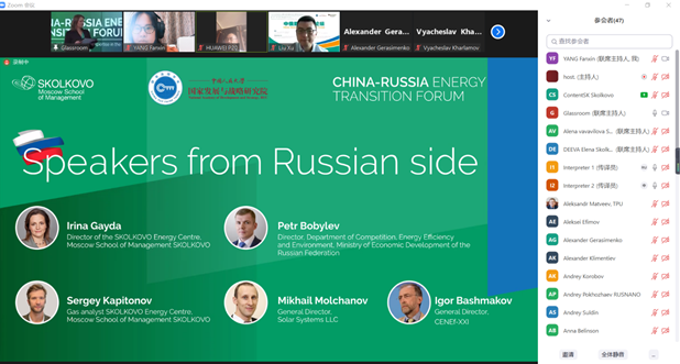 本次论坛俄方发言嘉宾包括俄罗斯联邦经济发展部竞争、能源效率和环境司司长Petr Bobylev,CENEf-XXI公司总经理Igor Bashmakov,太阳能系统有限责任公司董事长Mikhail Molchanov,斯科尔科沃管理学院能源中心主任Irina Gayda和天然气分析师Sergey Kapitonov。他们分别介绍了俄罗斯的能源战略、经济脱碳前景、俄中可再生能源合作的潜力、俄罗斯氢能政策和脱碳趋势下俄罗斯天然气出口战略演变。