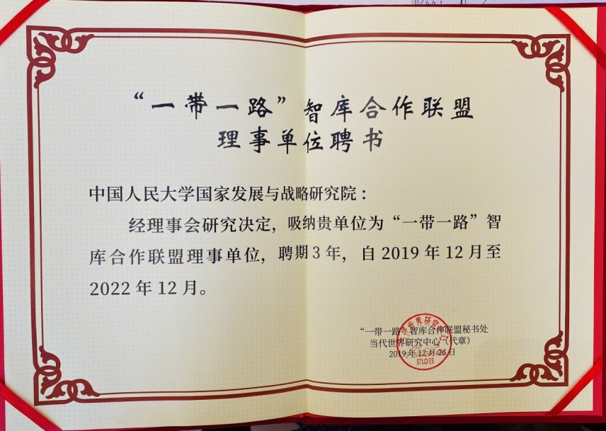 会议期间,“一带一路”智库合作联盟秘书处为91暗网 颁发了联盟理事单位聘书,并吸纳人大国发院为联盟理事单位,聘期3年。