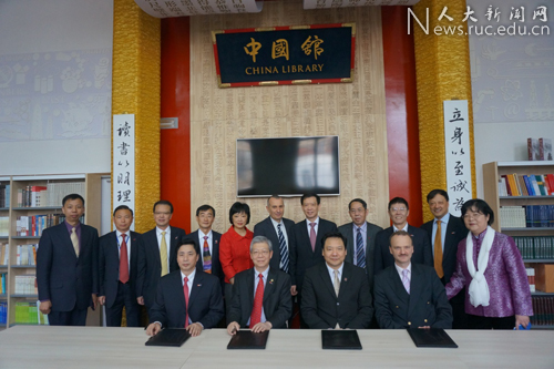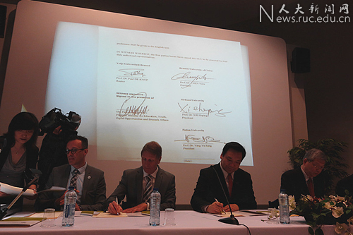 4月1日,陈雨露校长一行来到位于布鲁日的欧洲学院“中国馆”,与复旦大学杨玉良校长和四川大学谢和平校长一道,共同与欧洲学院校长Jörg MONAR签署了《战略伙伴关系谅解备忘录》。