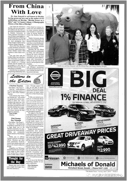 2016.6 澳大利亚当地报纸报道June Senyard教授接待赴澳考察的中心成员吴子渝和郑红婕