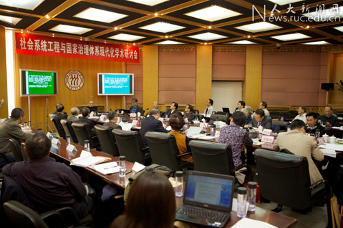 随后举行的“社会系统工程与国家治理体系现代化”学术研讨会分两个单元,从社会系统工程视角研究国家治理体系的现代化,探讨了社会系统工程的思想和方法,国家治理体系的理念、框架及其现代化的目标、机制和路径等问题。社会系统工程研究中心研究员黄顺基、陈禹、金元浦、杨光斌、张云飞、林坚以及钟义信、涂序彦、孟凯韬、何华灿、王宏波、田鹏颖、吕志奎等14位学者作了主题报告。来自全国各高校的50余位学者就社会系统工程与国家治理这一话题展开了讨论。